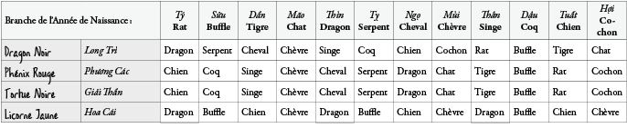 Repérer la branche correspondant à votre année lunaire de naissance dans le tableau ci-dessous et reporter les quatre caractères dans les cases des animaux mentionnés.