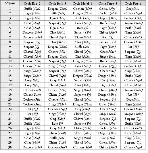 Pour déterminer sa position dans le tableau, il est nécessaire de connaître votre jour lunaire de naissance et l'élément du cycle du temps. L'Empereur se loge dans la case animal indiqué dans l'image ci-contre. Noter le caractère "Empereur" dans votre tableau.